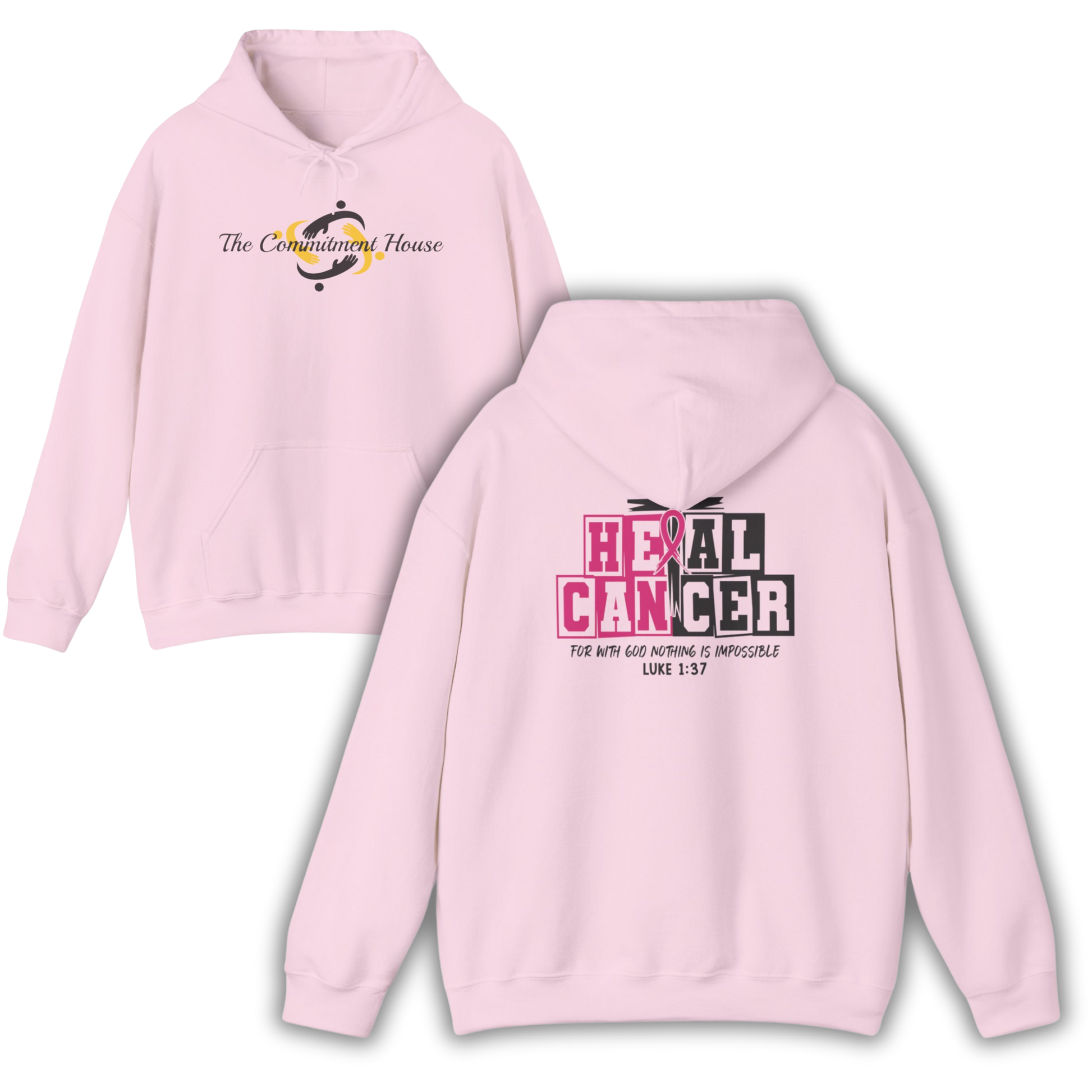 Stand strong in faith and support the fight against cancer with the Commitment House Heal Cancer collection. Featuring the inspiring front logo and a bold back design with a pink ribbon, cross, and the powerful scripture Luke 1:37 – “For with God nothing is impossible.”
